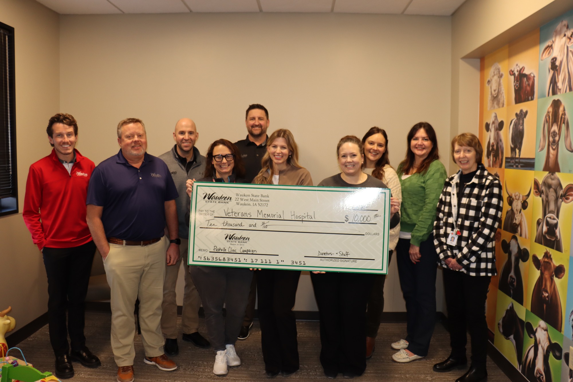 Pictured, left to right, is Mason McMillan, Dan Denk, and Justin Sweeney of Waukon State Bank; Laura Baxter, Chief Clinic Officer; Chad Curtin, Gina Curtin and Jennier Hooten of Waukon State Bank; and Mason Keiran, Nurse Practitioner; Angela Taylor, Behavioral Health Nurse Practitioner; and Beth Shafer, Growth and Development Coordinator, from Veterans Memorial Hospital and Clinics.