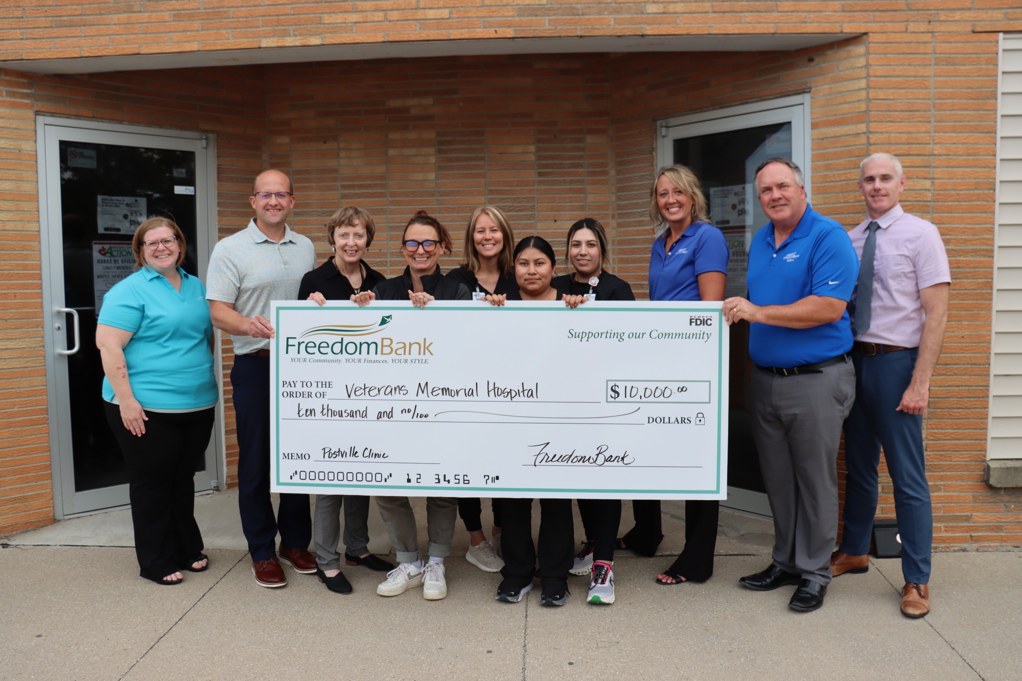 FreedomBank is the first corporate sponsor to come forward with a large donation to the fundraising campaign for a new Veterans Memorial Hospital Postville Medical Clinic. Their generous donation of $10,000 was recently gifted to this project as a pacesetting donation to help jump-start this campaign.