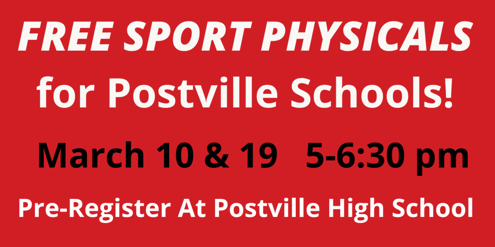 Free Sport Physicals will be offered at the Veterans Memorial Hospital Clinic-Postville for all junior high and high school students who need the physical for participating in school sporting events. These will be held at the Postville Clinic on the following dates and times: