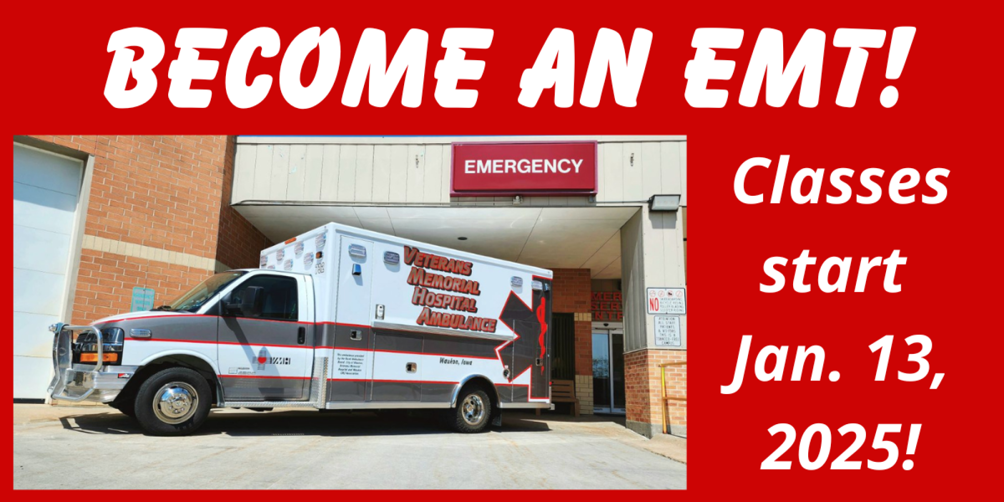 NICC will be offering a face-to-face EMT Class in Waukon beginning January 13. Enthusiastic, willing volunteers wanting to truly help people are needed to fill this class. The class will meet two nights per week, Mondays and Wednesdays, from 6-10 pm, and clinics will be held in person. Students who successfully complete this class and the certification examination will be able to volunteer on their own community’s ambulance service or rescue squad, as well as be prepared for careers in emergency services.