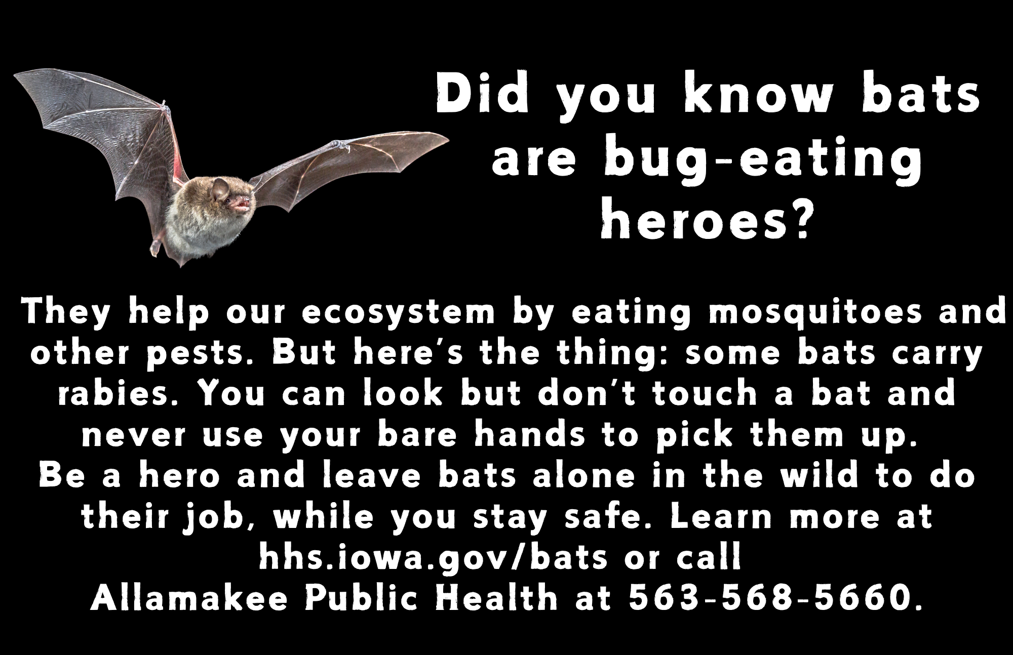 Bats play a vital role in our ecosystem especially as a natural source of insect control; however each year, there are bats tested in Iowa that are positive for rabies and can pose disease risk to humans, livestock and pets.